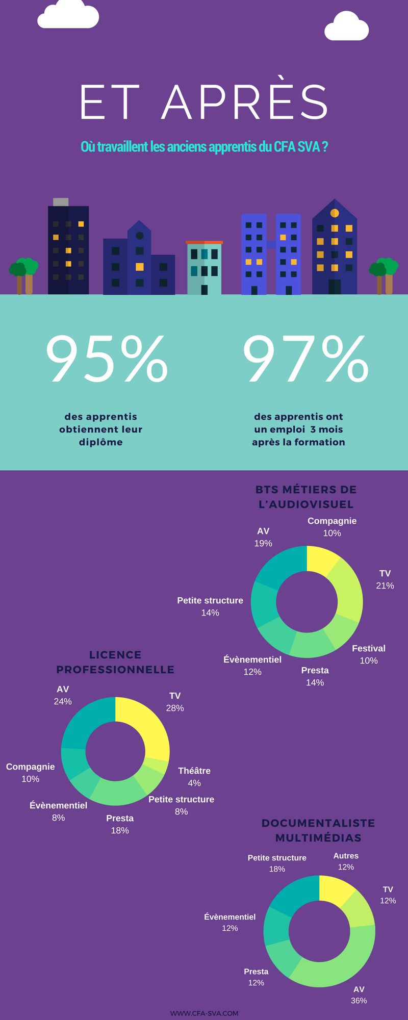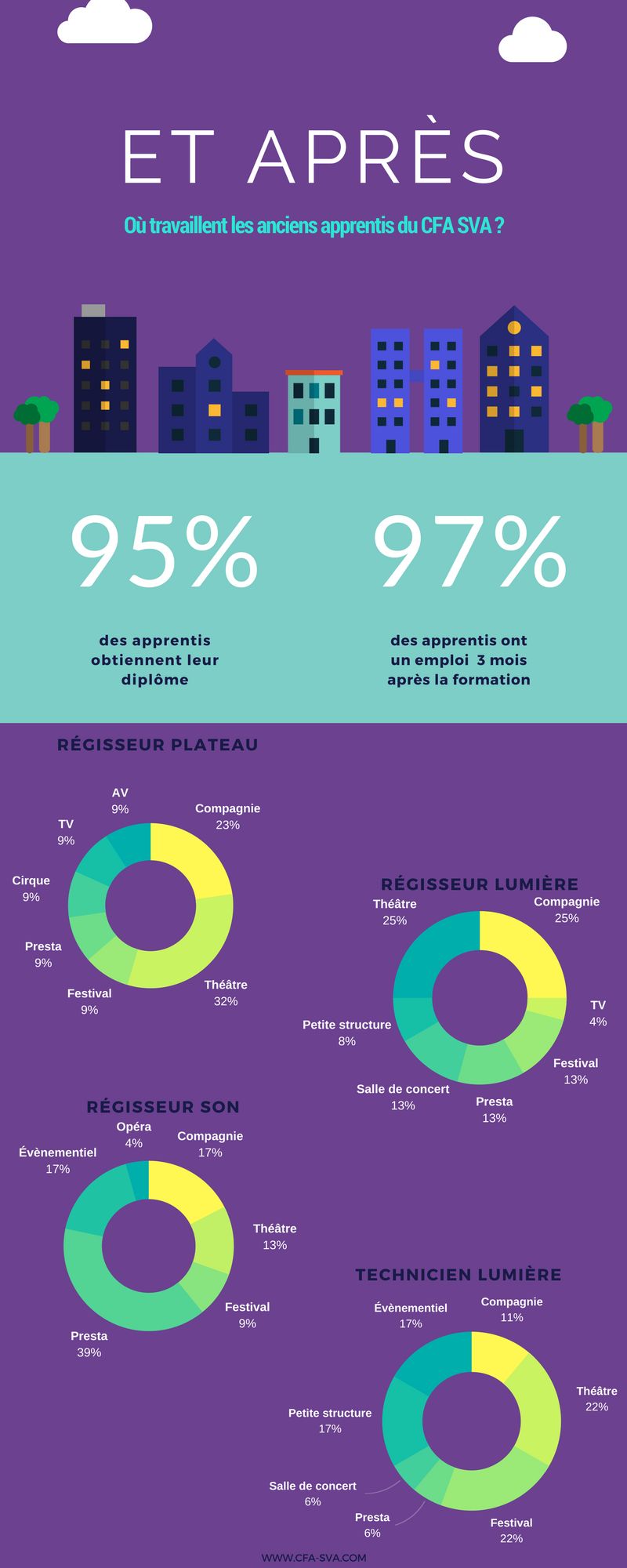 Après le CFA-SVA, nous avons aussi constaté avec plaisir que ces jeunes professionnels travaillent dans toutes les structures de spectacle vivant, théâtre, compagnies, festivals, événementiel, prestataires, petites ou grosses entreprises, preuve de leur polyvalence et de leur employabilité.